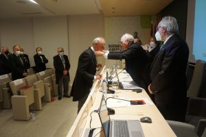 Finalizado el acto de ingreso se procedió por el Sr. Secretario General a tomar juramento o promesa firmando el documento de aceptación. Tras el acto de protesta el Sr. Presidente le hizo entrega, en nombre de S.M. el rey de España Felipe VI, de la medalla académica y del documento que le acredita como Académico de Número asignándole, a su elección, a la Sección 5ª, Historia de la Veterinaria, Ética y Legislación donde realizará sus trabajos de investigación.
