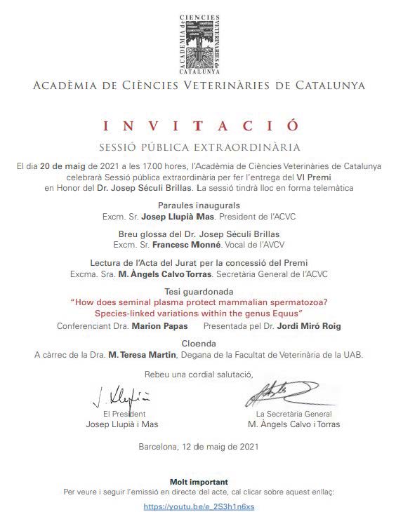 El día 20 de mayo de 2021 a las 17:00 horas, la Acadèmia de Ciències Veterinàires de Catalunya celebrará Sesión pública extraordinarioa para la entrega del VI Premios en Honor del Dr. Josep Séculi Brillas. La sesión tendrá lugar de manera telemática.