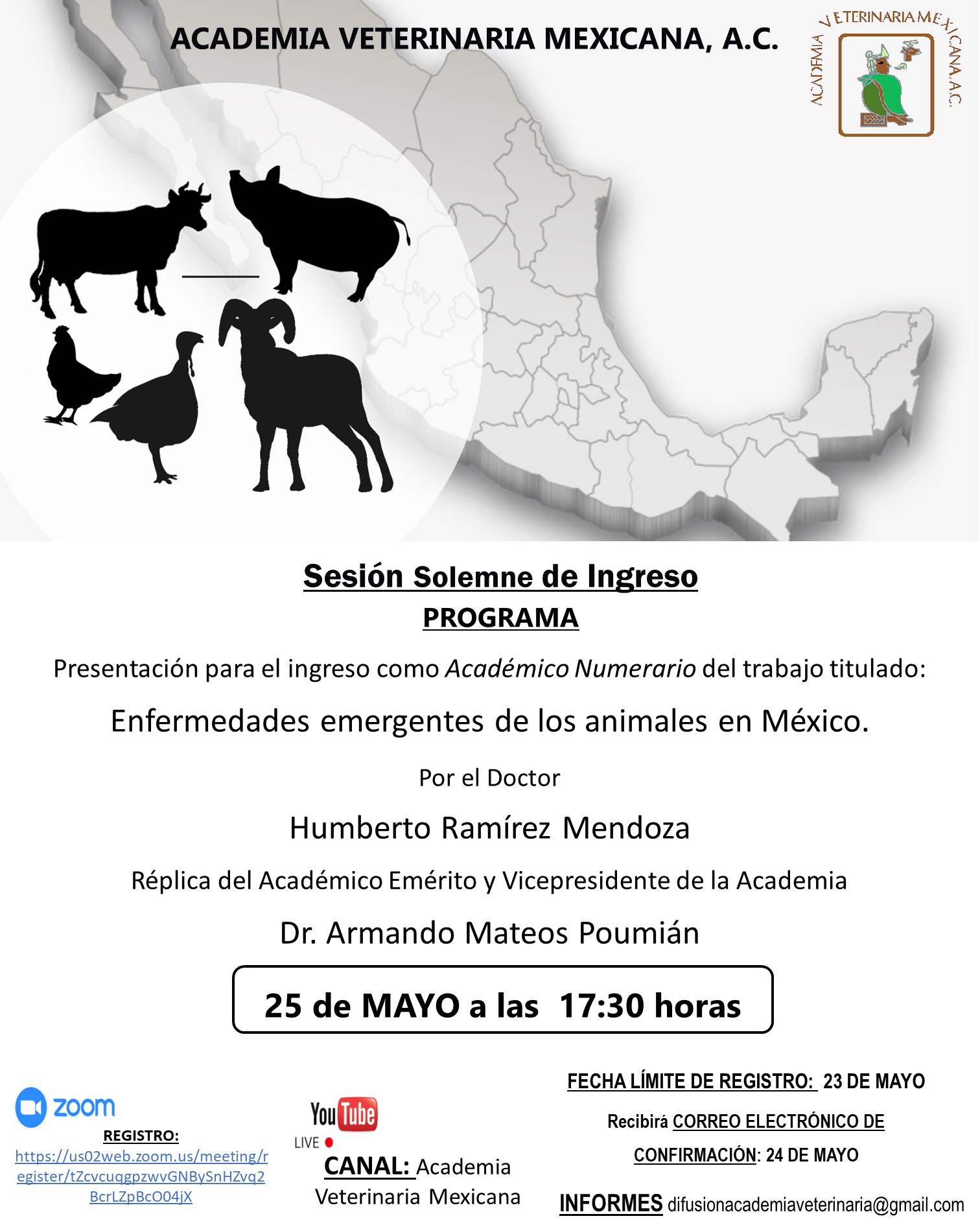 El día 25 de mayo a las 17:30 horas (horario México), tendrá lugar la sesión de ingreso como Académico Numerario del Dr. Humberto Ramírez Mendoza.