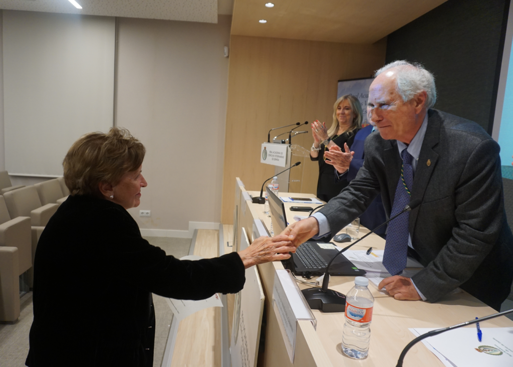 Al finalizar el turno de intervenciones, el presidente Dr. Arturo Anadón Navarro se dirigió a D.ª Rosario Cariñanos, esposa de D. Leopoldo. Y antes de levantar la sesión, le hizo entrega del diploma de reconocimiento de la Real Academia.