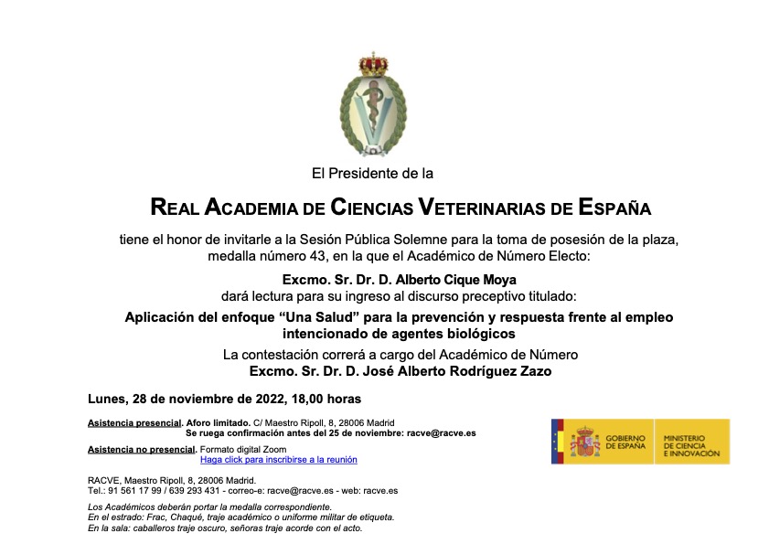 Ceremonia de Ingreso del Académico de Número, Excimo. Sr. D. Alberto Cique Moya, con la conferencia titulada: “Aplicación del enfoque “Una salud” para la prevención y respuesta frente al empleo intencionado de agentes biológicos”. Madrid 28 de noviembre de 2022.