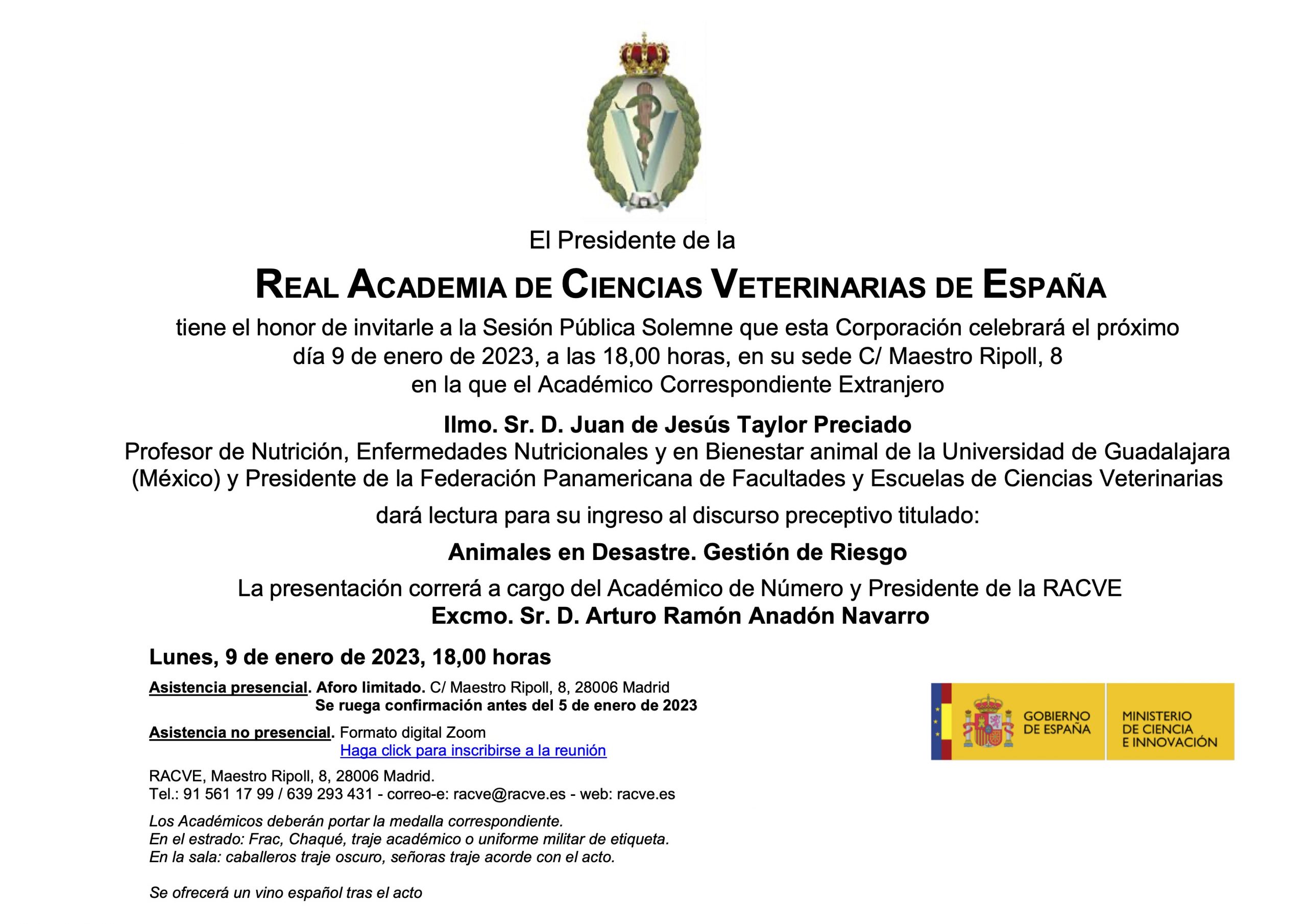 Sesión de ingreso del Ilmo. Sr. Dr. D. Juan de Jesús Taylor Preciado, como Académico Correspondiente Extranjero, celebrado el pasado día 9 de enero de 2023, donde dió lectura para su ingreso al discurso preceptivo titulado:”Animales en Desastre. Gestión de Riesgo.”.La presentación corrió a cargo del Académico de Número y Presidente de la RACVE, Excmo. Sr. D. Arturo Ramón Anadón Navarro.