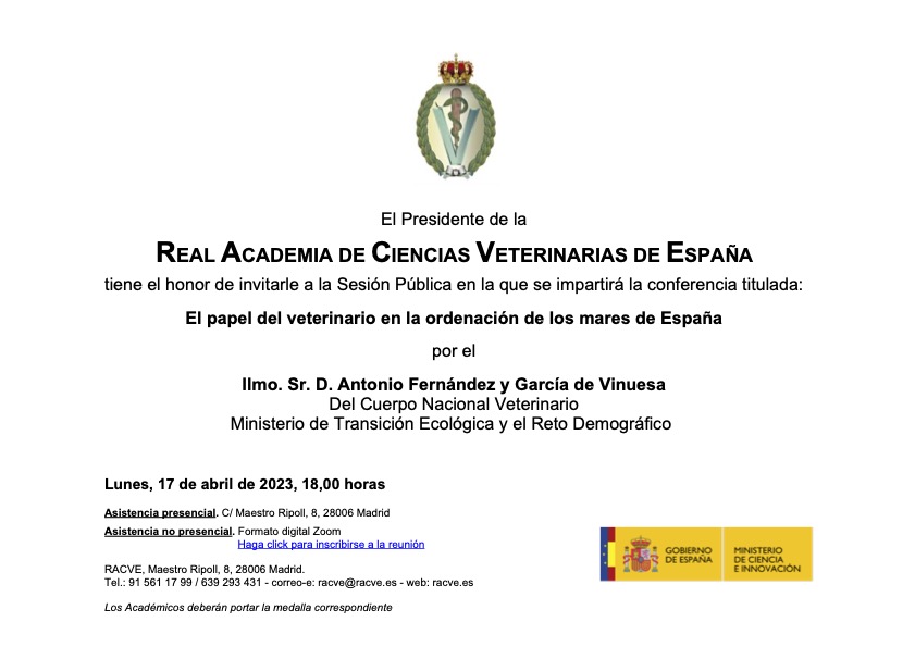 Videoconferencia del Ilmo. Sr. D. Antonio Fernández y García de Vinuesa, Del Cuerpo Nacional Veterinario; Ministerio de Transición Ecológica y Reto Demográfico, que versó sobre el tema: “El papel del veterinario en la ordenación de los mares de España”, pronunciada el lunes 17 de abril de 2023.