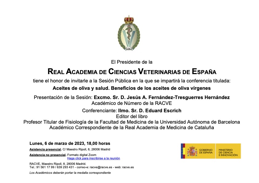 Conferencia del lmo. Sr. D. Eduard Escrich, Editor del libro “Aceites de oliva y salud. Beneficios de los aceites de oliva vírgenes”; Profesor Titular de Fisiología de la Facultad de Medicina de la Universidad Autónoma de Barcelona; Académico Correspondiente de la Real Academia de Medicina de Cataluña.